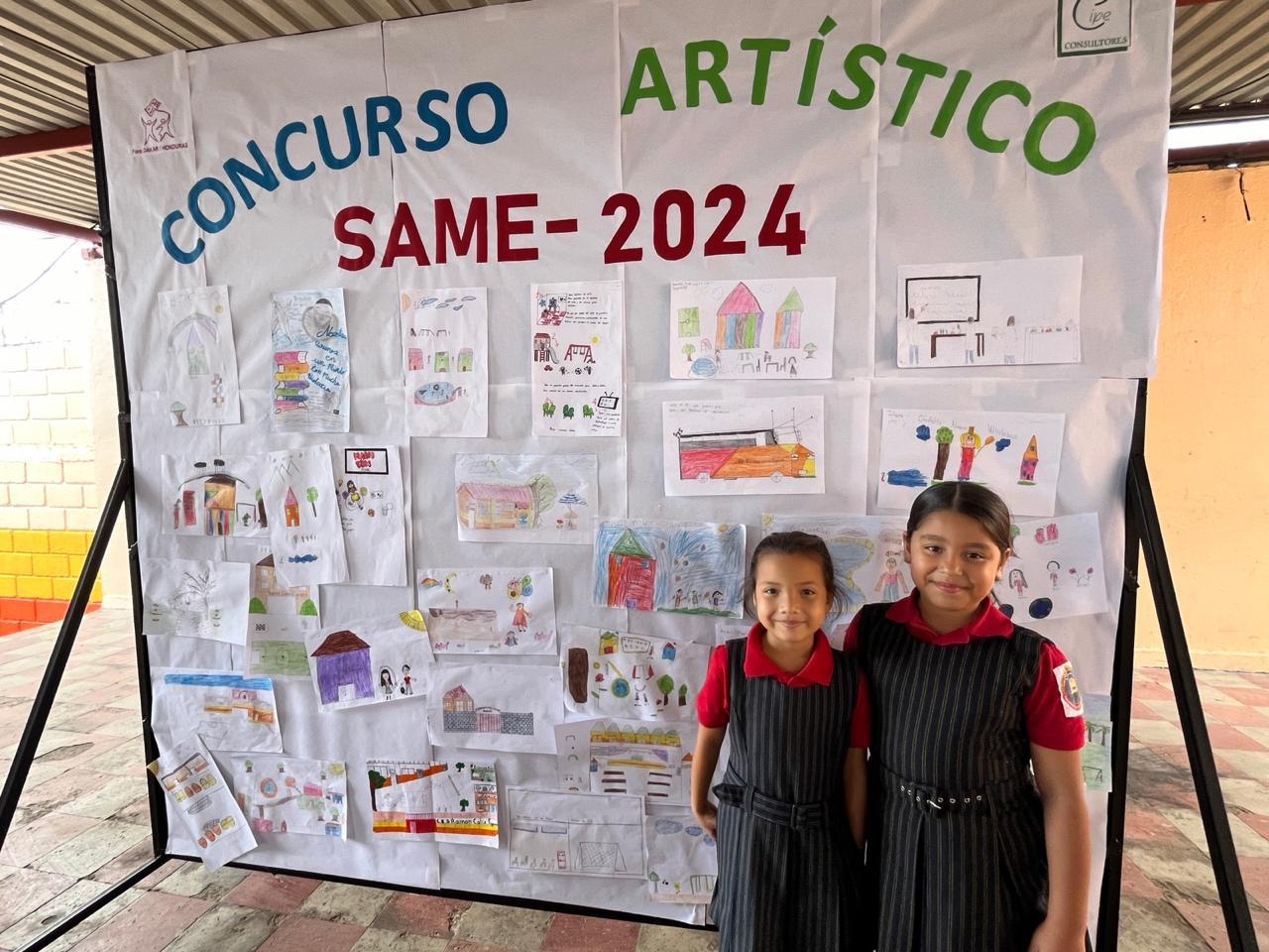 Dos estudiantes con dibujos creados en el evento SAME 2024